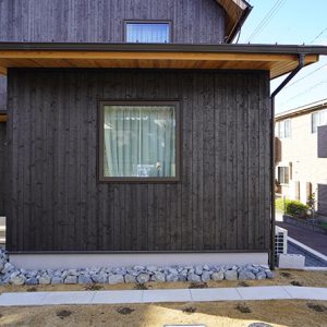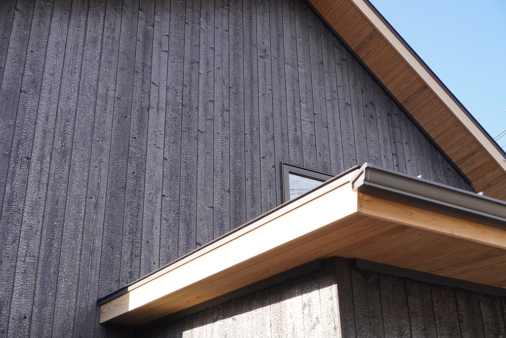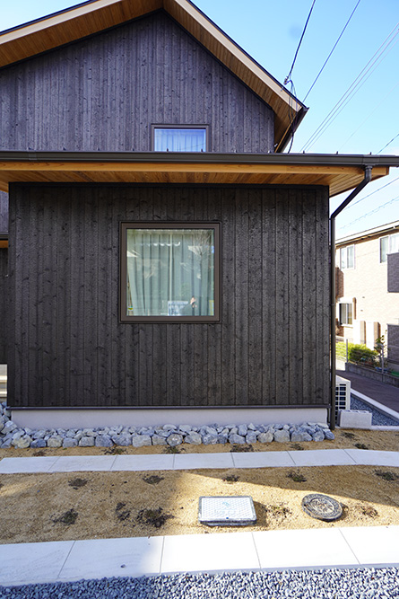 外壁はお施主様が小さい時の実家が焼杉で触ったり、落書きしたりの思い出をマイホームでも再現したい部分から素焼きの焼杉を採用しています。