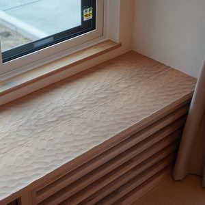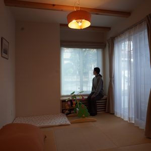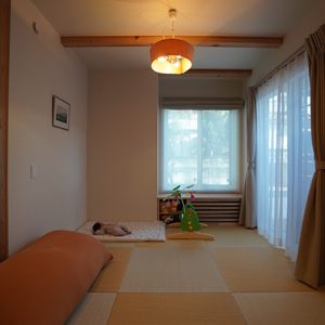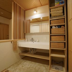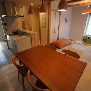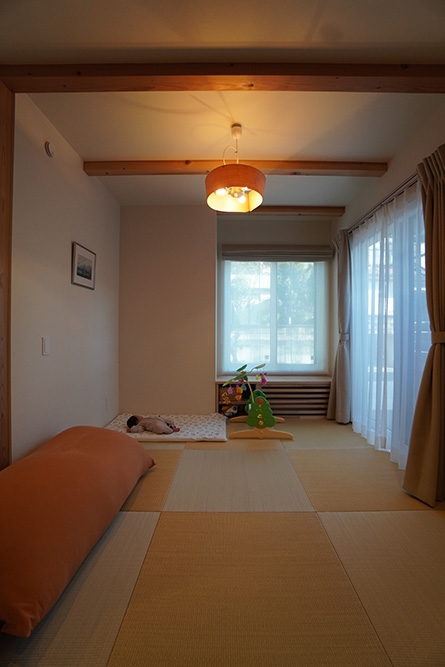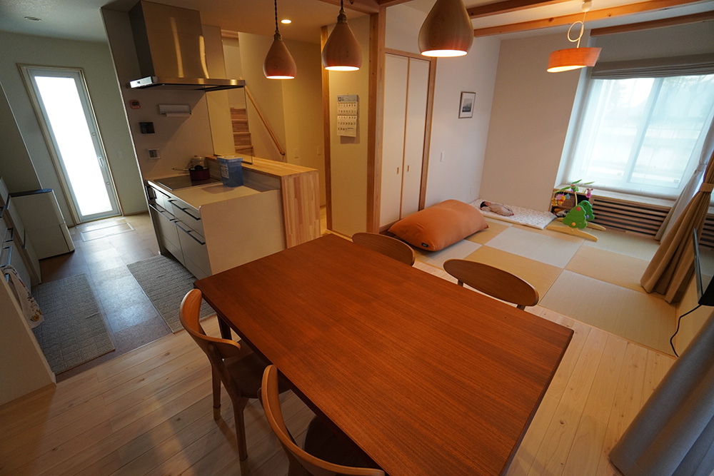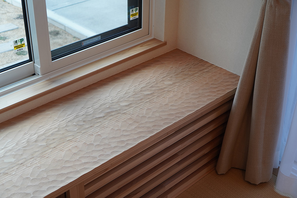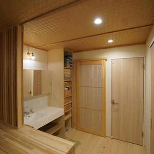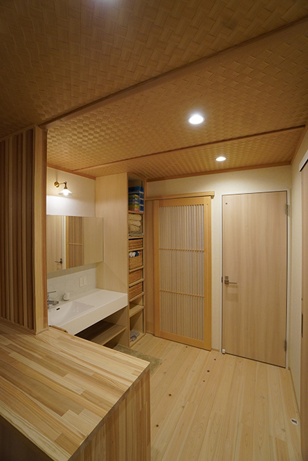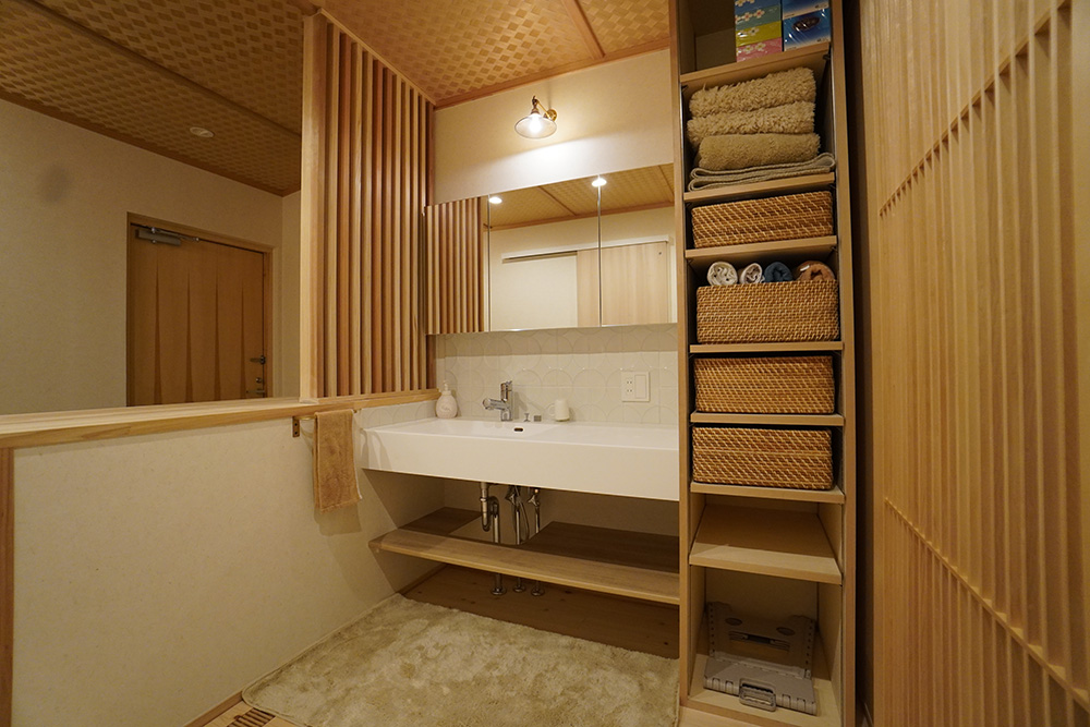 和が好きなご家族!!リビングでは畳での暮らし、ベンチは杉のなぐり仕上げ、玄関ホールの天井はアジロ天井、床は吉野檜や吉野杉を採用いたしました。