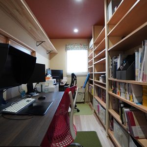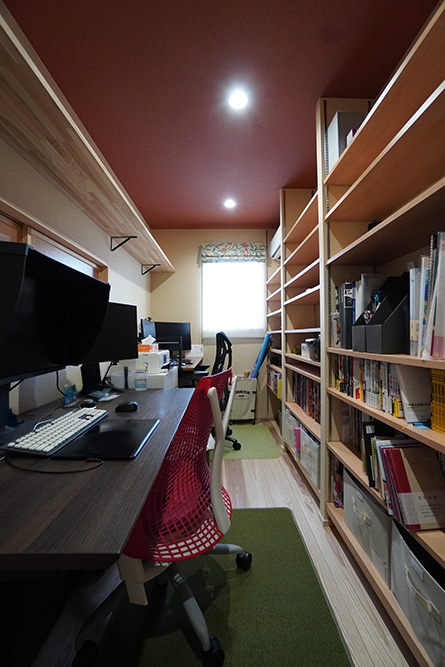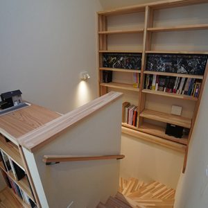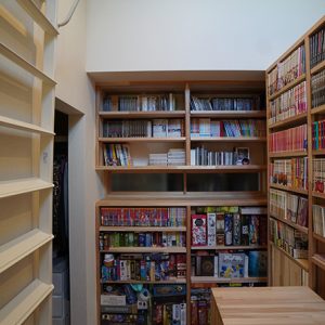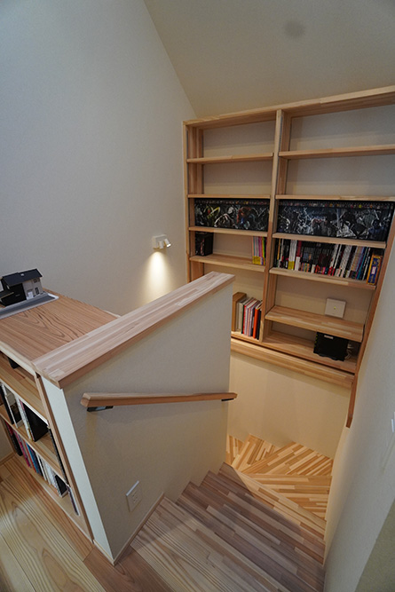 2階のホールには趣味と仕事のための大量の本棚空間を採用、天窓を設けることで照明がなくても明るい空間になっています。